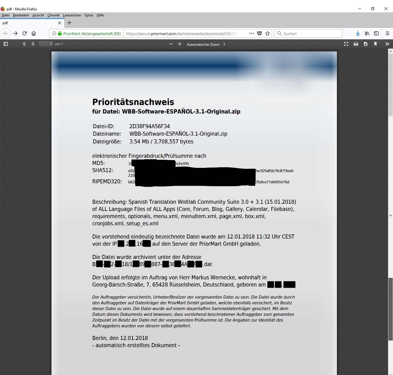 Der Verlauf und die Entwicklung jeder einzelnen Sprachdatei der allesumfassenden Übersetzung der VieCode Software ist bei einem Notar in Potsdam, Berlin-Brandenburg, Deutschland hinterlegt. Somit ist das Projekt in seinen einzelnen Entwicklungsschritten und Versionen nutzungsrechtlich nachvollziehbar.