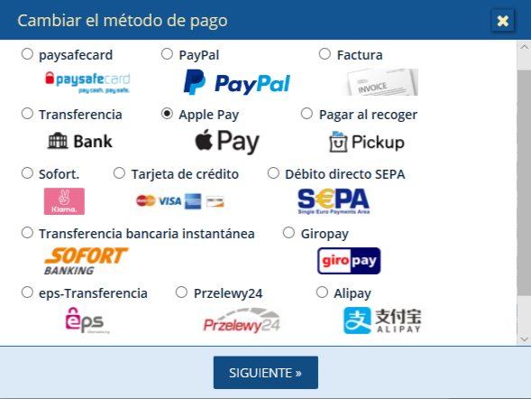 PayPal + Apple Pay + PaySafeCard + Klarna/Sofort + CreditCard + Przelewy24 + Alipay + EPS + Giropay